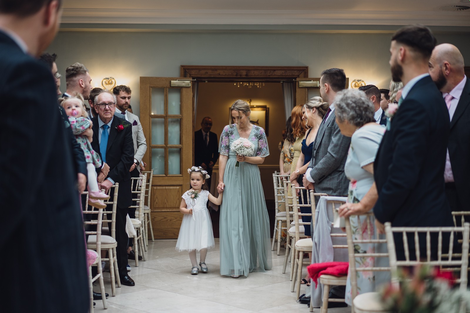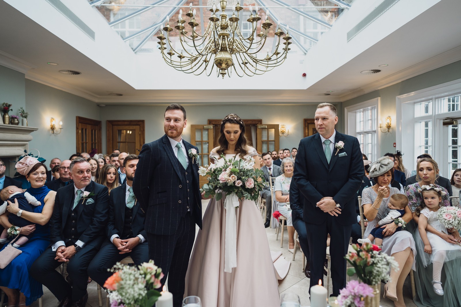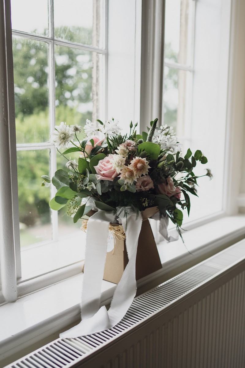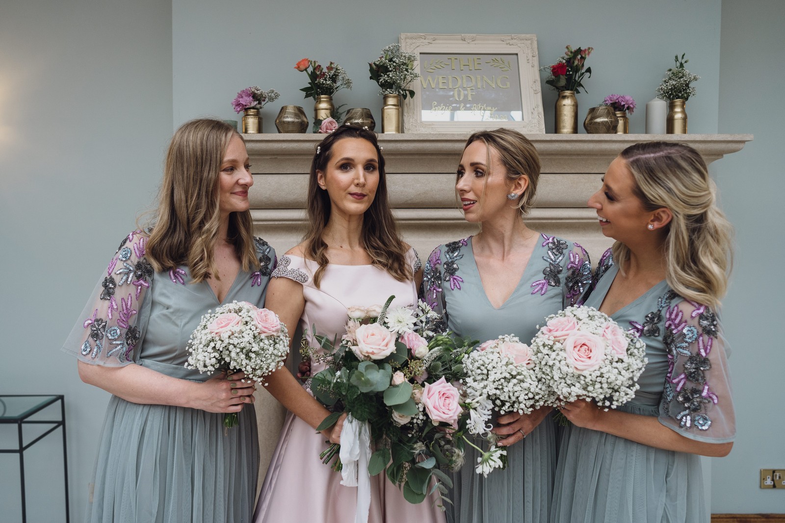 Sophie looked absolutely stunning in a blush pink dress as she walked down the aisle after her mint green wearing bridesmaids holding a bouquet of roses and eucalyptus.