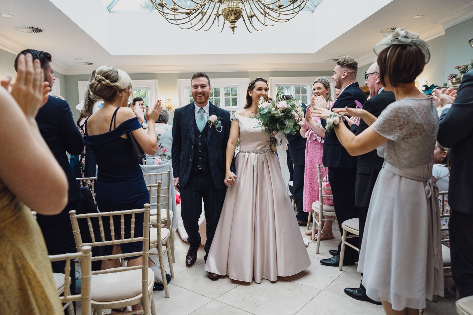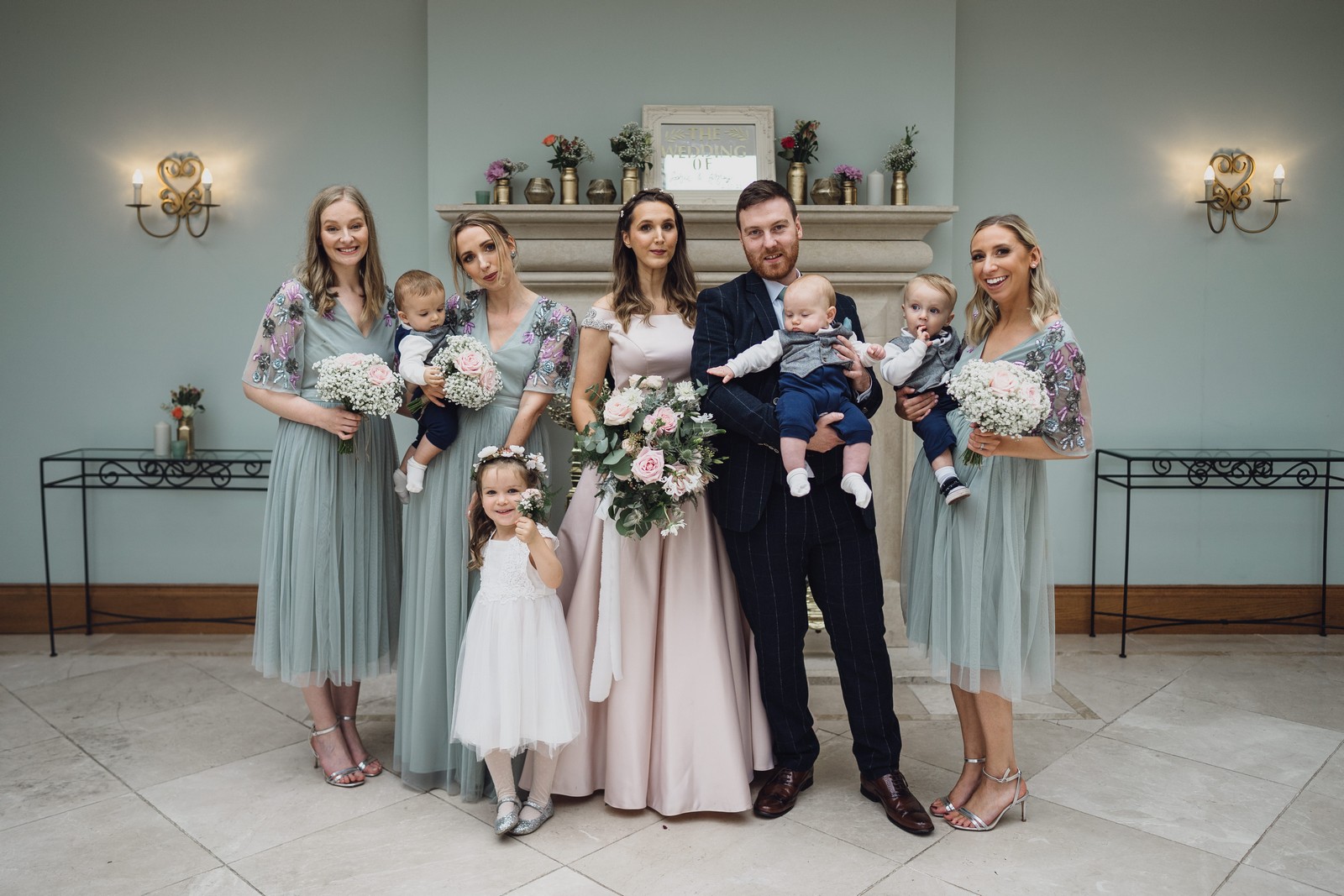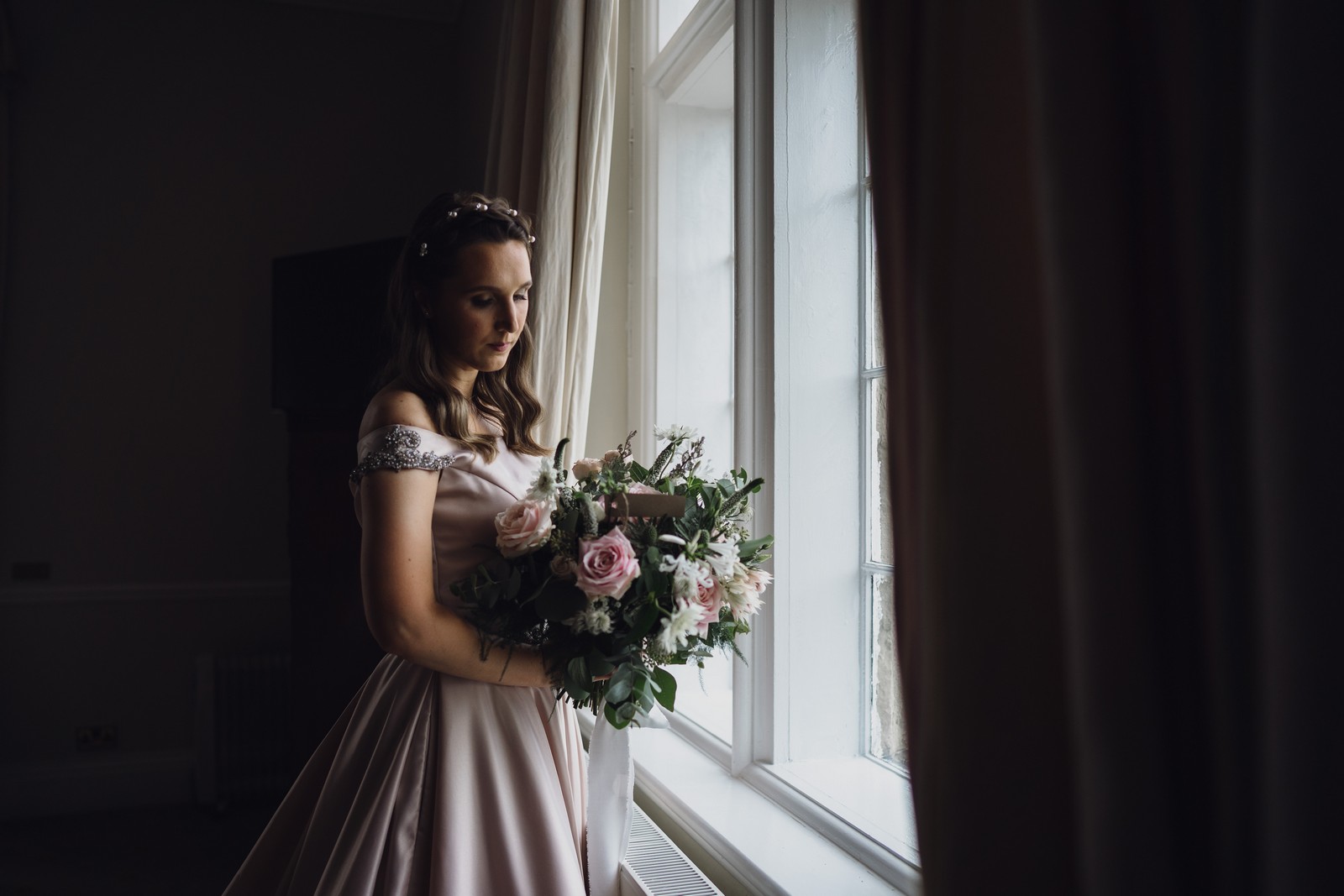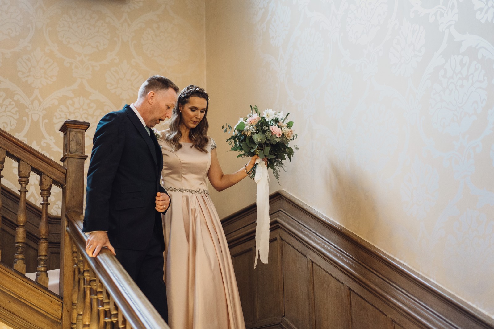 Sophie looked absolutely stunning in a blush pink dress as she walked down the aisle after her mint green wearing bridesmaids holding a bouquet of roses and eucalyptus.